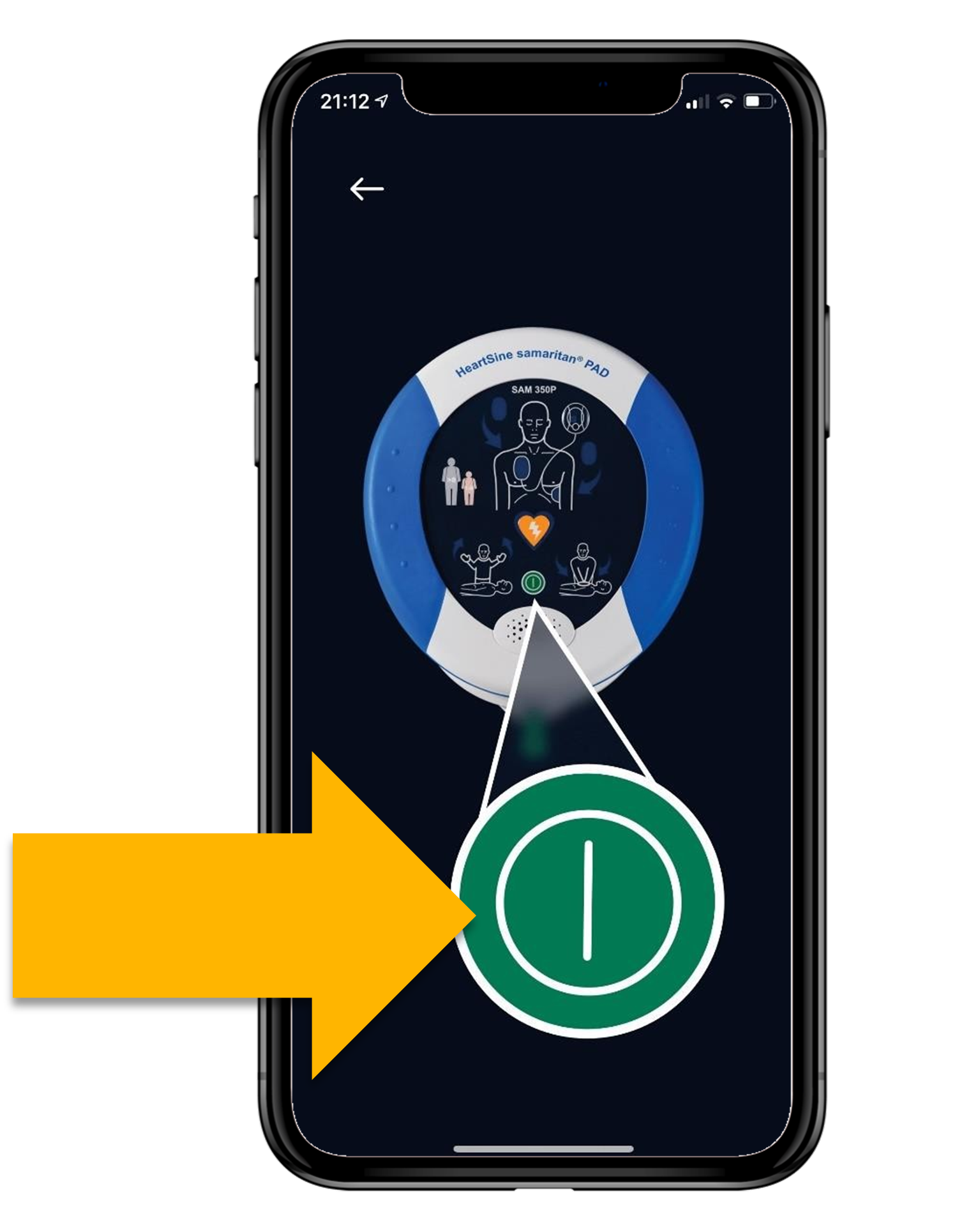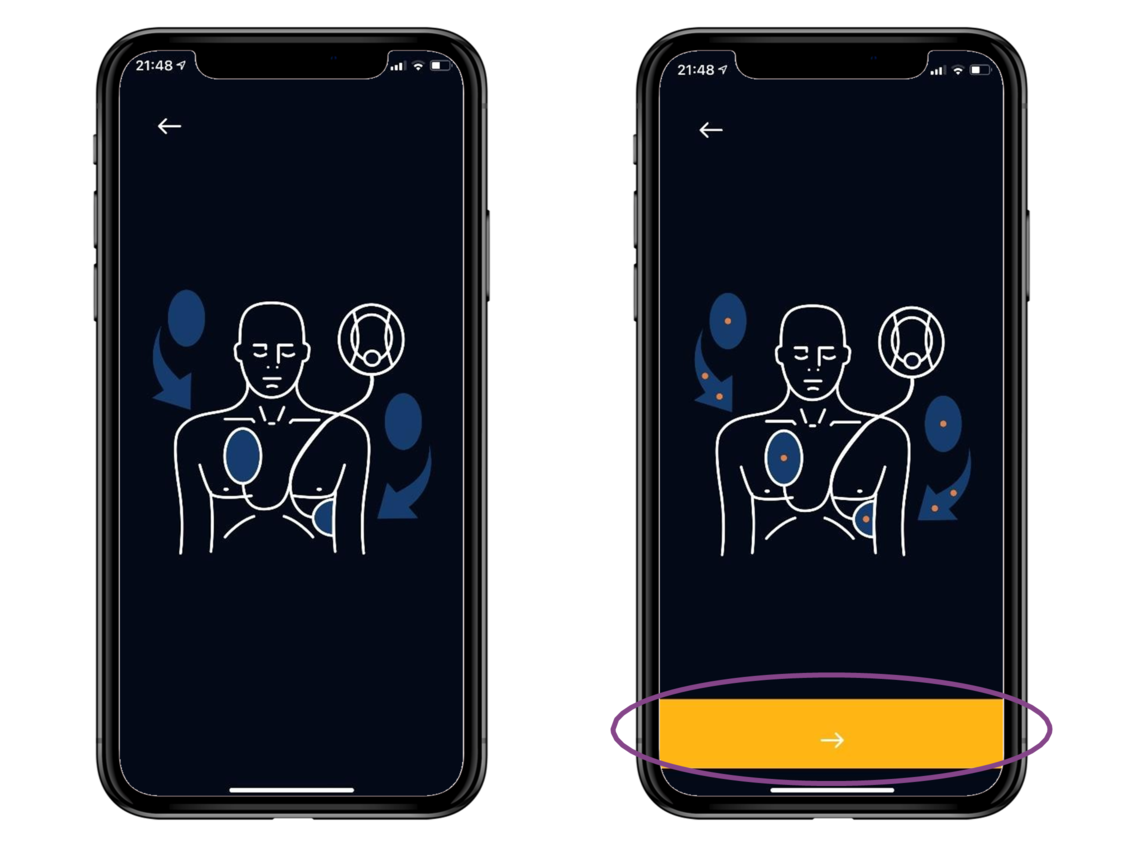 Uporabnik mora po namestitvi elektrod pritisniti rumeno puščico v aplikaciji, da se postopek nadaljuje.